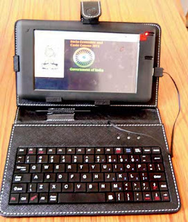 Enumeration: Same area (blocks) as used for the Census 2011 were used for the SECC . The basic and important thing for enumeration is the enumeration block containing 125 to 150 household with population 650 to 700 people . In SECC government used Respondent based canvasser method. In other words, enumerator goes to every household and asks questions, the responses of the person are noted down without any verification. No proof or document is asked from answering person in SECC. Acknowledgement slips were given by enumerator to each household immediately after enumeration in that household is over. Separate questionnaires for rural and urban areas had been developed in SECC. The question on Religion and Caste are also part of these questionnaires. That important data like household number, household persons name get loaded on to hand held devices. Data entry was done on a hand-held enumeration device (tablet PC) in English. (a photo of tablet pc used in SECC 2011 is given below)
